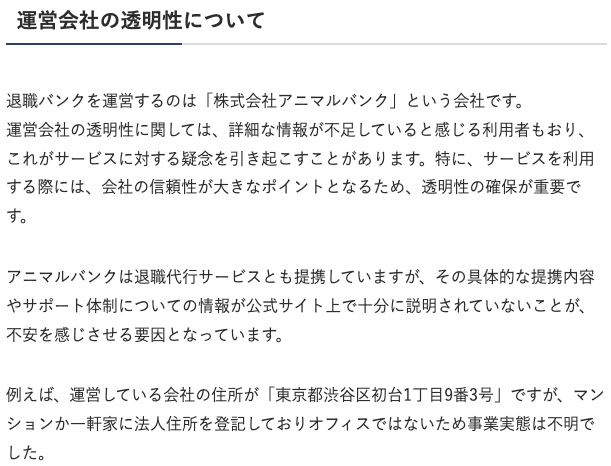 退職バンクを運営しているのは「株式会社アニマルバンク」という会社らしいのですが、公式サイトを見ても詳細な情報が公開されていないため、不安しかない…