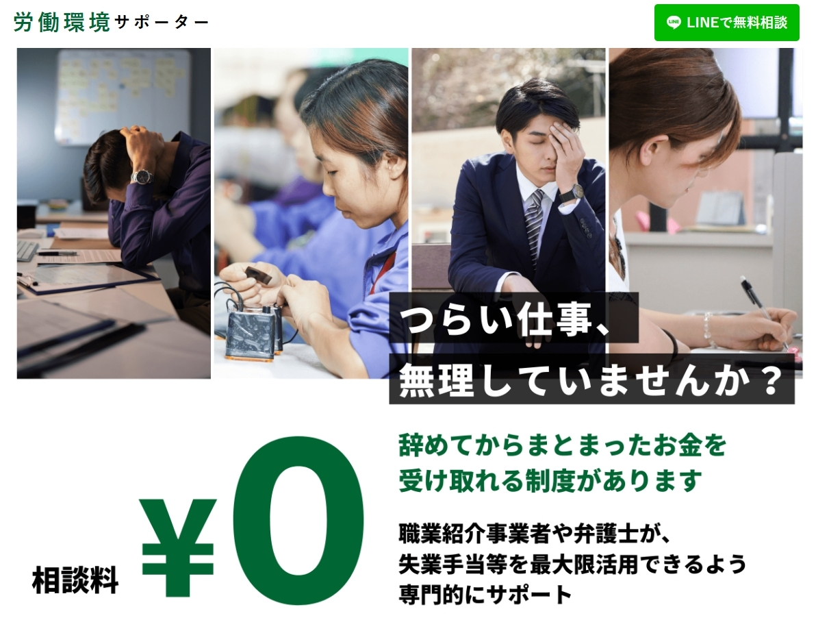 退職代行を0円で提供するプランがあり、加えて未払い残業代請求やハラスメント相談にも対応。失業保険サポートでは、傷病手当金+失業手当で最大2年半以上の給付を得る手続きを法律専門家が支援し、費用は33万円ほどとやや高めながら分割払い可・全額返金保証を備えています。